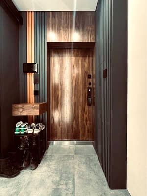 На фото финальный результат нашей работы – входная дверь в квартиру с отделкой откосов проема доборными элементами.